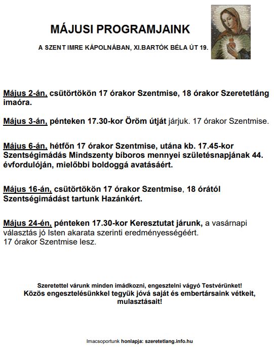 Keresztút az EP választás előtt Szentségimádás Hazánkért Szentségimádás tiszteletreméltó Mindszenty József bíboros boldoggá avatásáért Öröm útja Májusi imaórán így imádkoztunk Májusi házi feladatunk Májusi imaóra anyaga 2019 MÁJUSI PROGRAMJAINK Bejegyzés navigáció ÁLDOTT HÚSVÉTOT!2019 JÚNIUSI PROGRAMJAINK