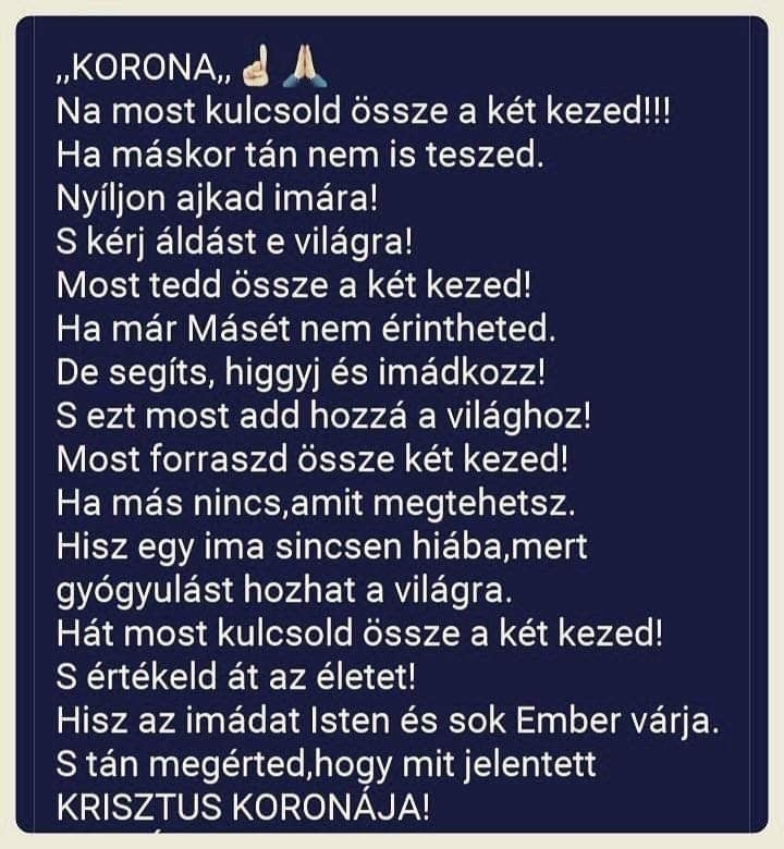 KORONA – NA MOST KULCSOLD ÖSSZE A KÉT KEZED Bejegyzés navigáció IMÁDKOZZUNK MINDADDIG AZ ŐRANGYALHOZ, AMÍG NEM TUDUNK SZENTMISÉN RÉSZTVENNIKÉRÉS A HAZÁTÓL – ÜLJ LE MAGYAR